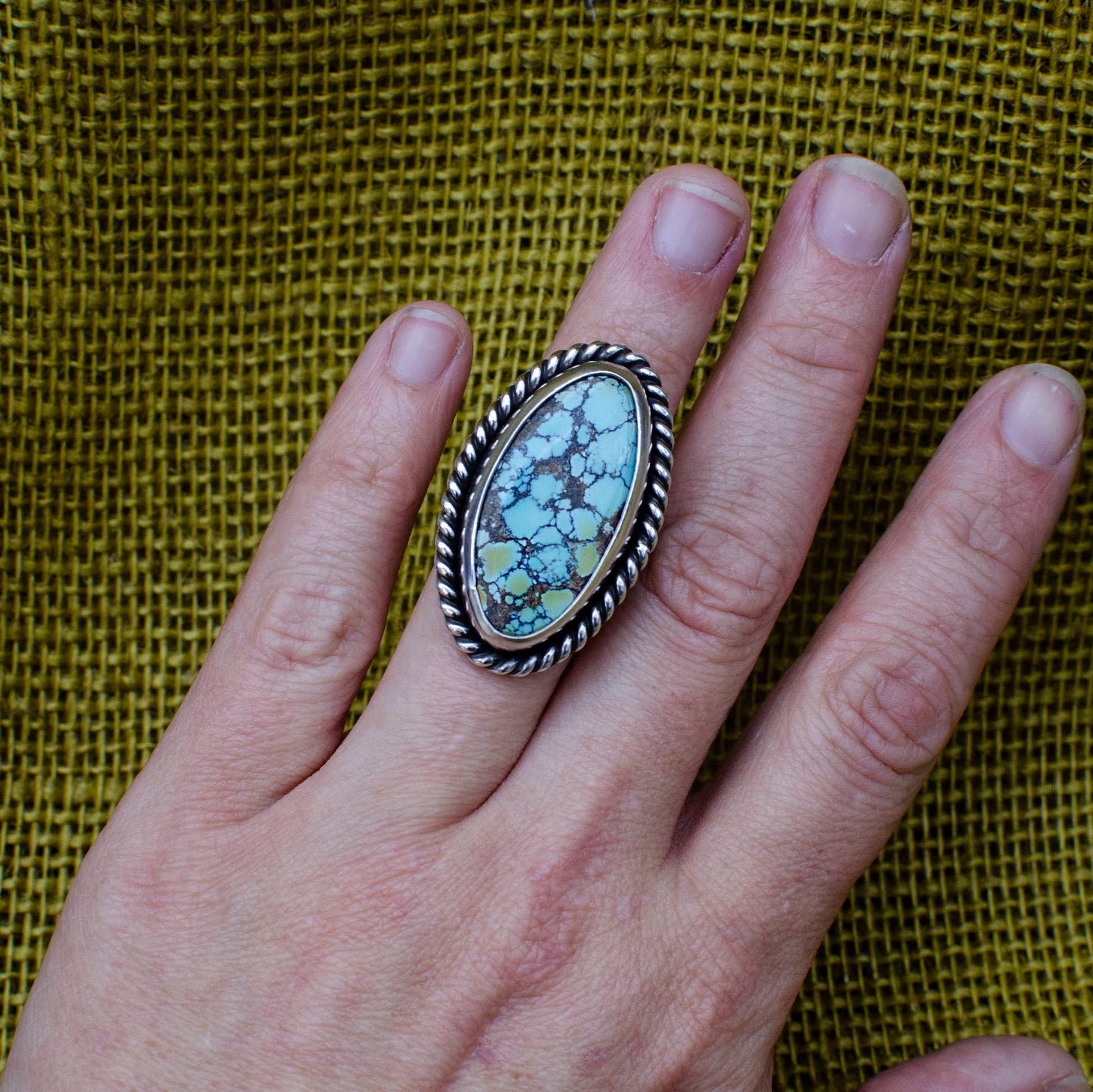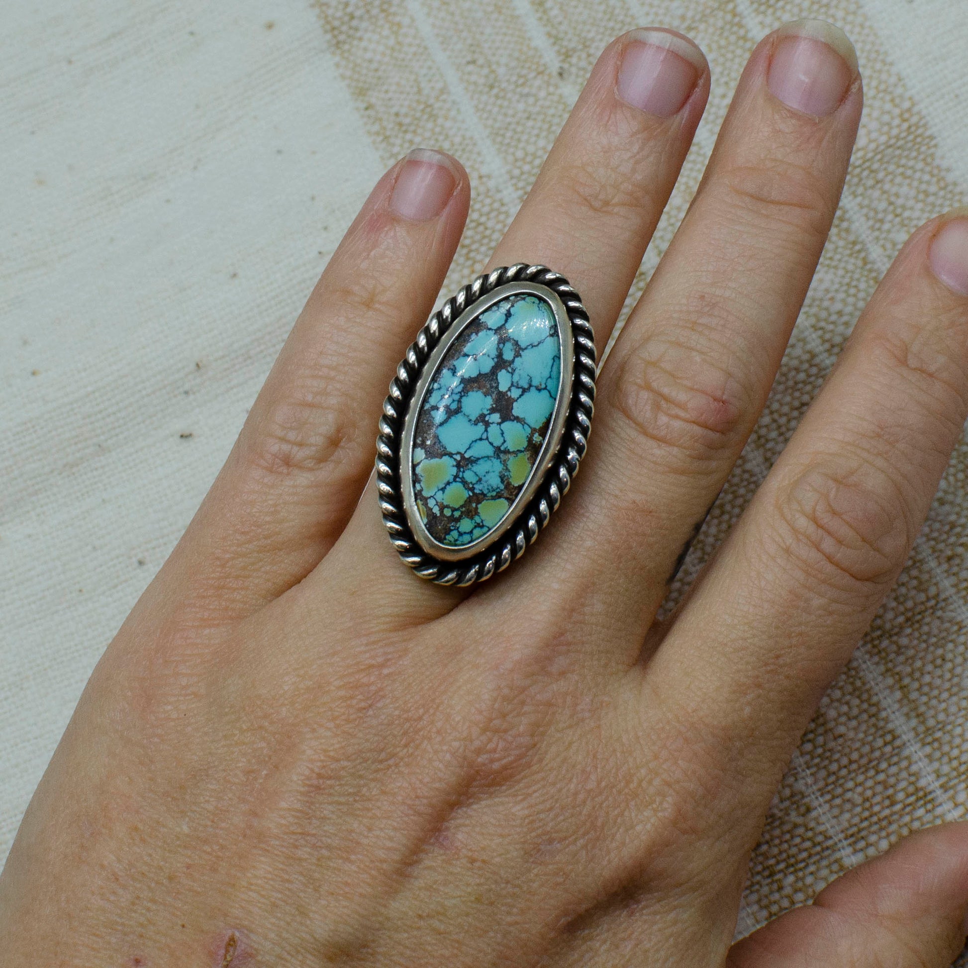 This sterling silver ring showcases a high-quality Quingu turquoise oval cabochon, framed in intricate sterling rope detailing. Size 8 and crafted for comfortable, everyday wear, making it the perfect staple turquoise ring with a touch of Western charm.