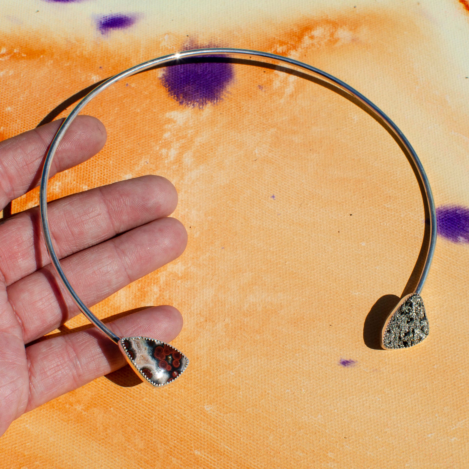 This one-of-a-kind sterling silver collar features vibrant red ocean jasper paired with sparkling Peruvian pyrite. Formed from solid 10-gauge silver wire, the collar is shaped to fit the natural curves of the neck for a comfortable and flexible fit.