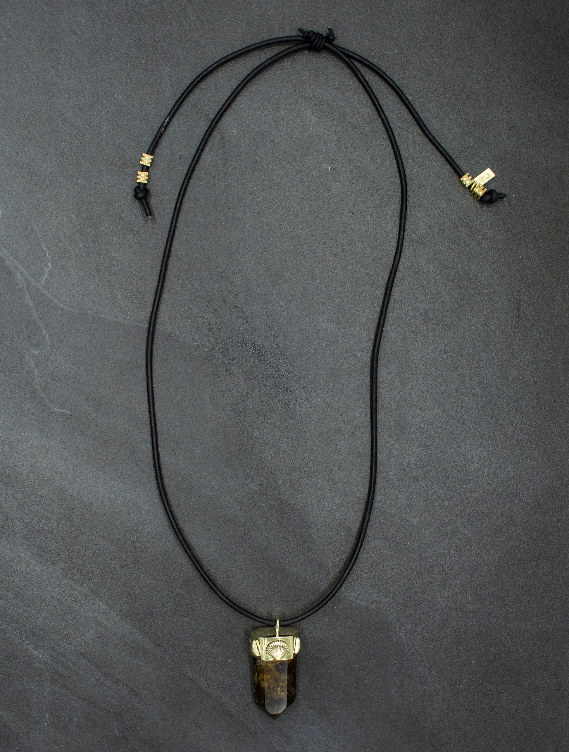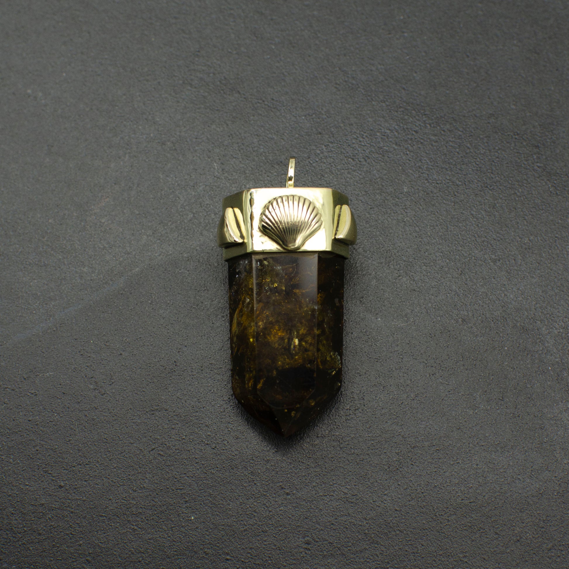 Handmade smokey quartz talisman featuring brass sea shells and other geometric shapes. Made in polished brass.