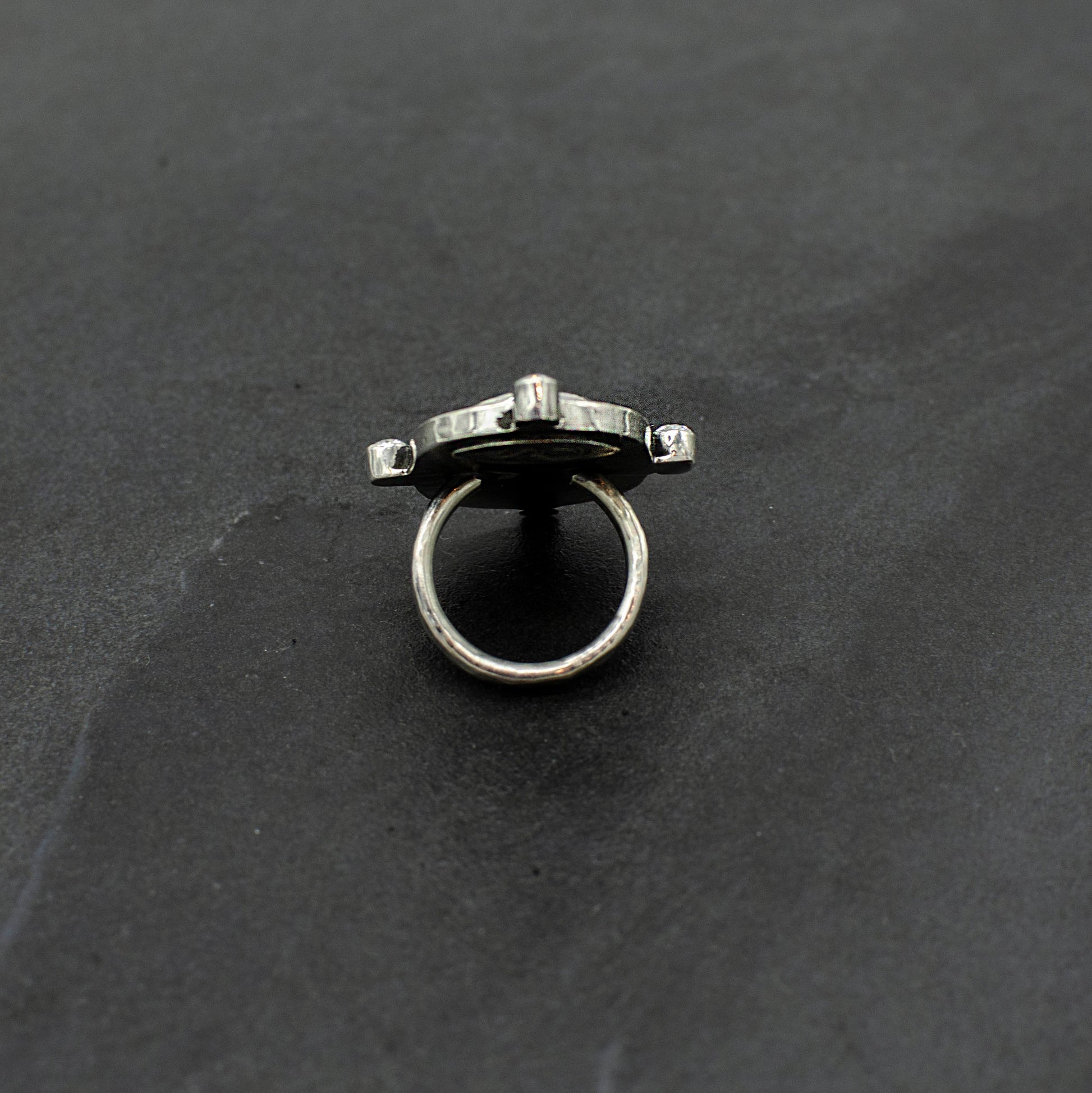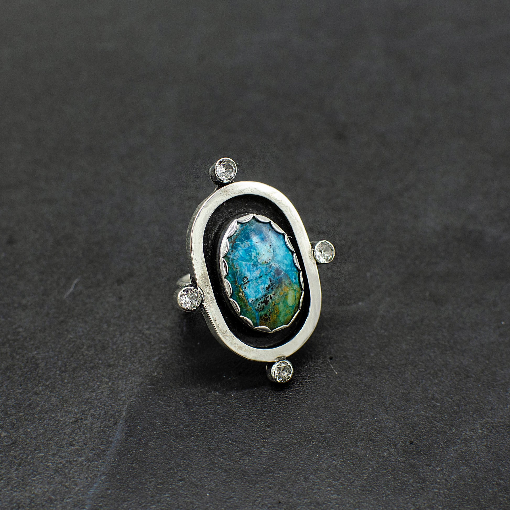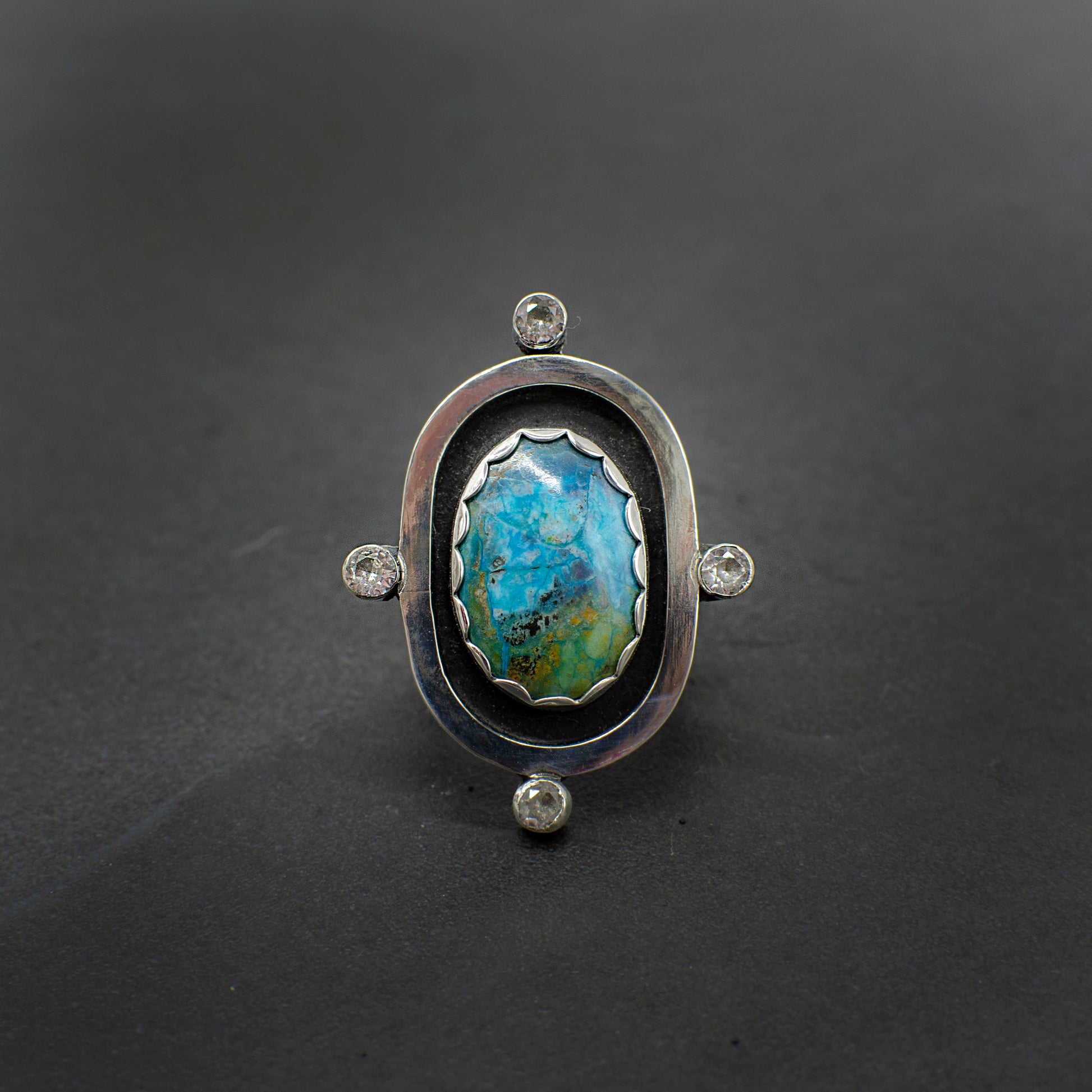Handmade sterling silver shadow box ring featuring an American mined turquoise and four white sapphires.