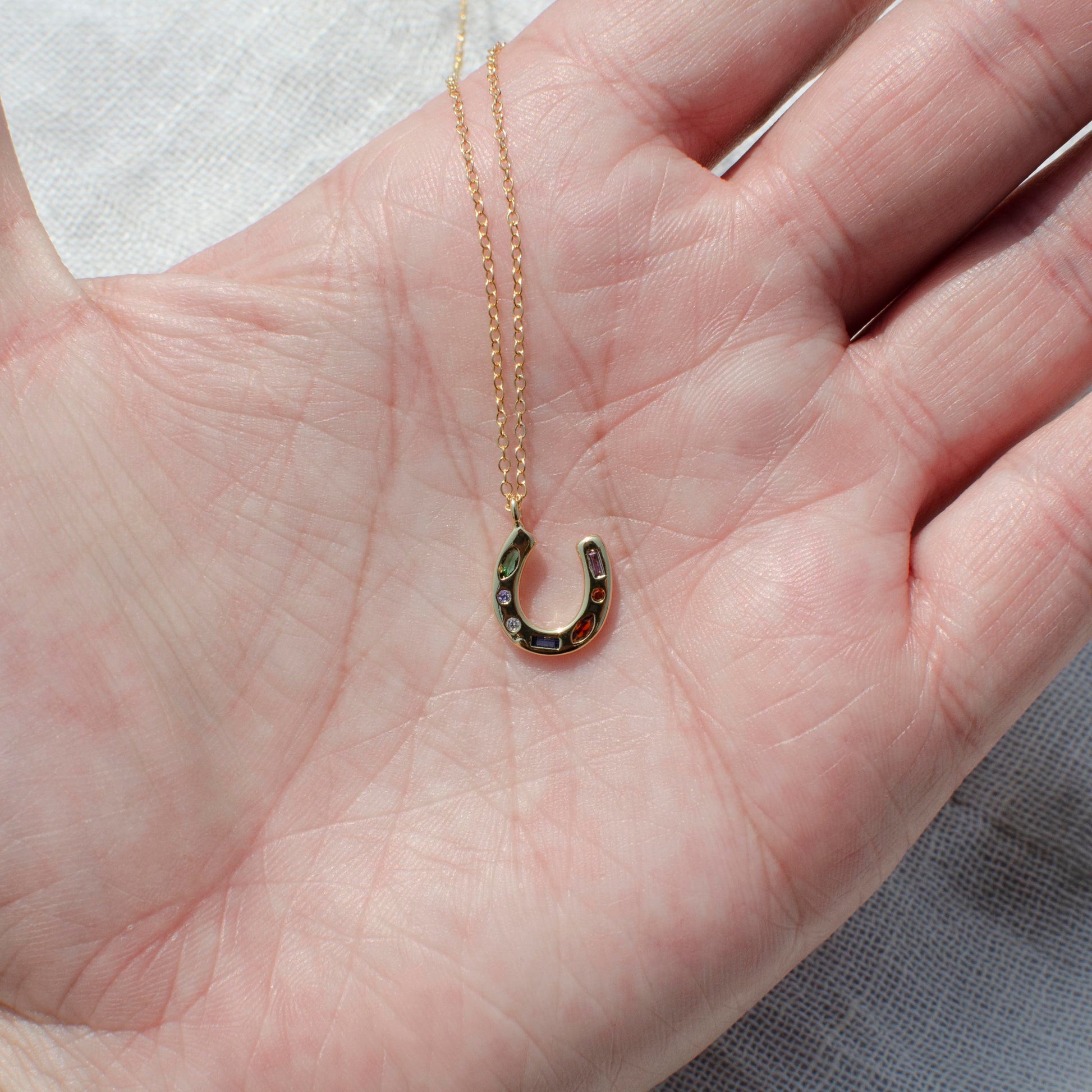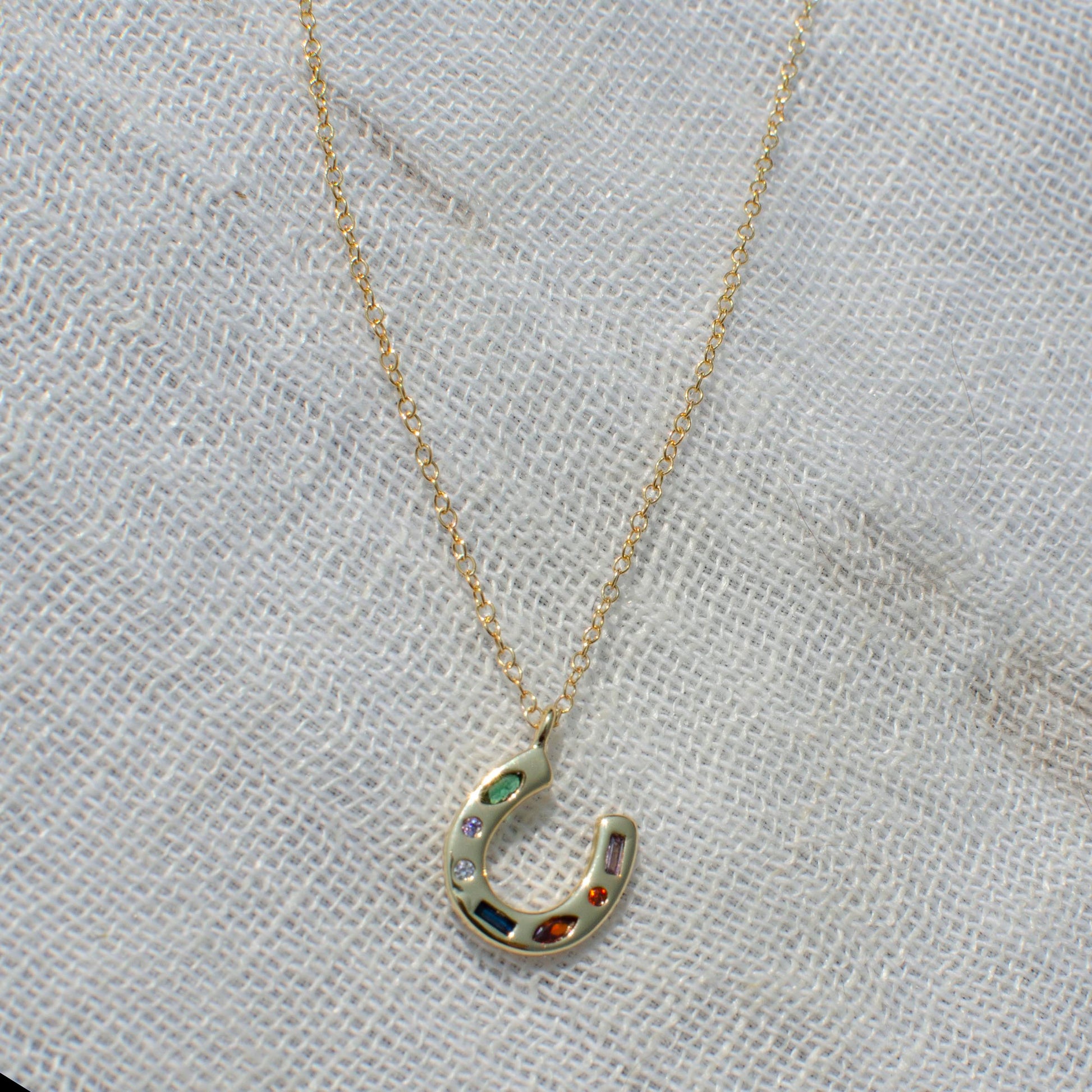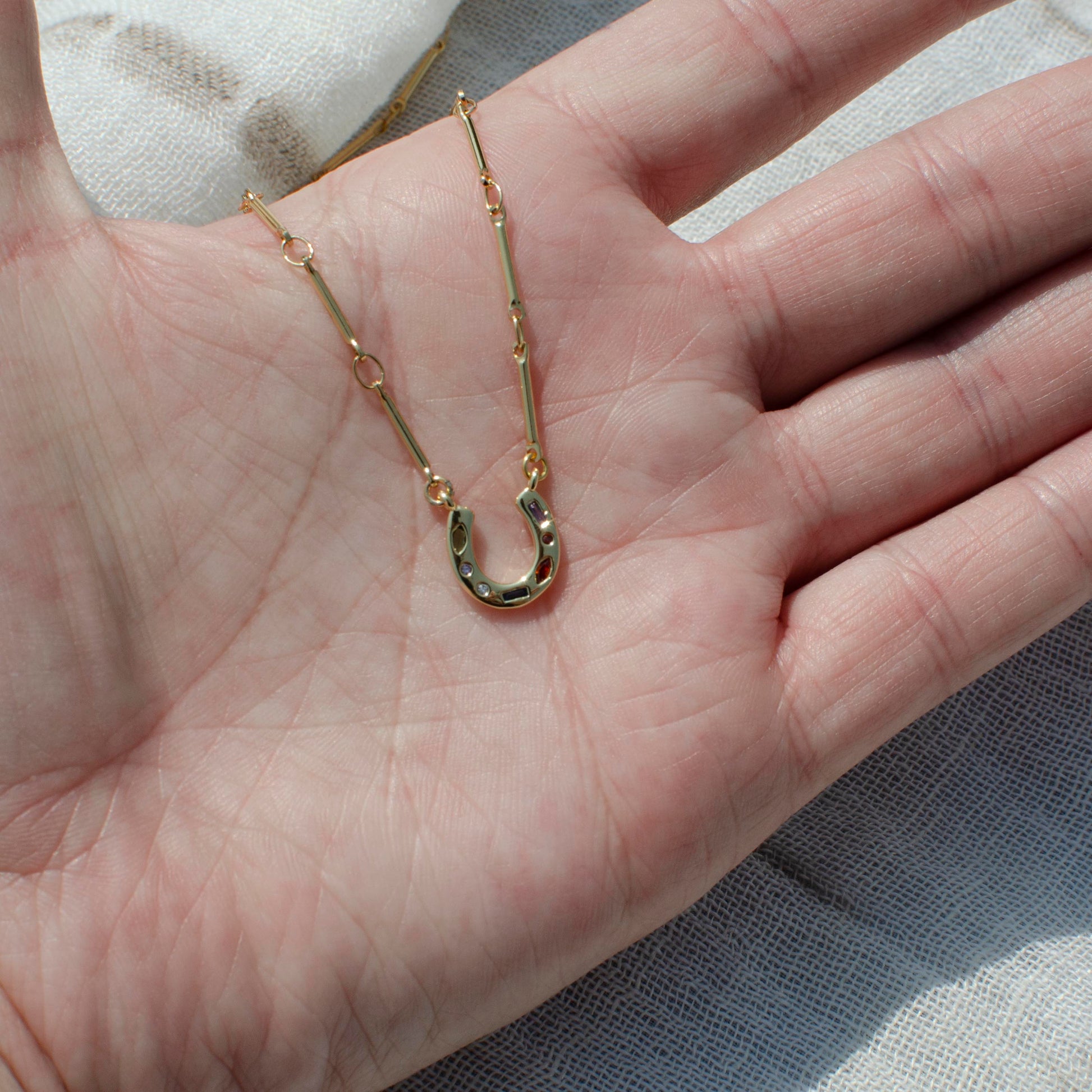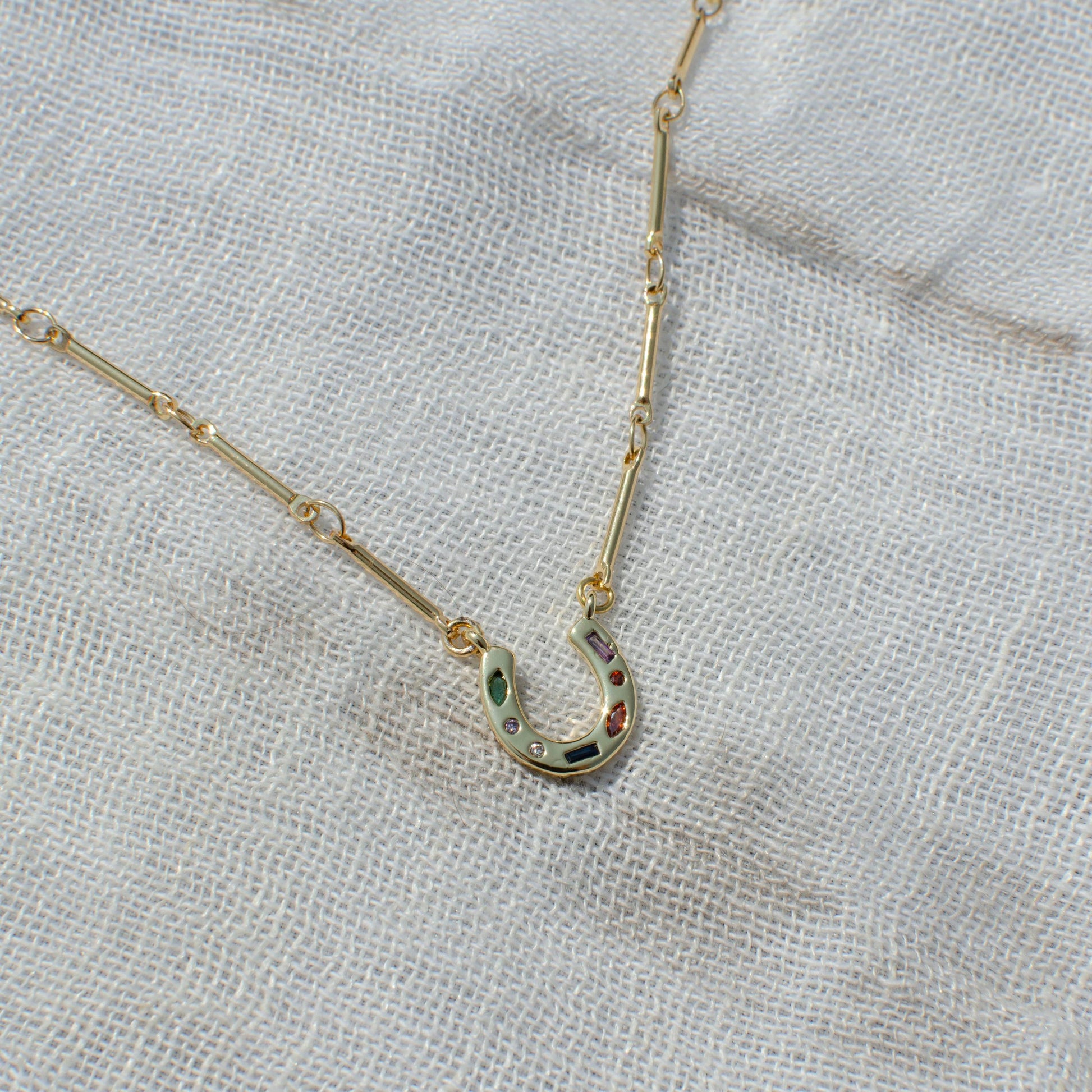 Discover our beautifully crafted 14k gold plated horseshoe pendant necklaces, featuring vibrant multi-colored glass crystals in an array of unique shapes. Available in two distinct styles: the double link is elegantly strung on a 14k gold plated bar chain, while the single link is paired with a dainty 14k gold plated cable chain. Avavilable in 16" or 18" chain lengths, each with a 2" extender. Perfect for everyday wear or layering with other pieces, these versatile necklaces are designed for both style and durability. Plus, this necklace may even bring you good luck! Hand crafted with care in Nashville, TN.