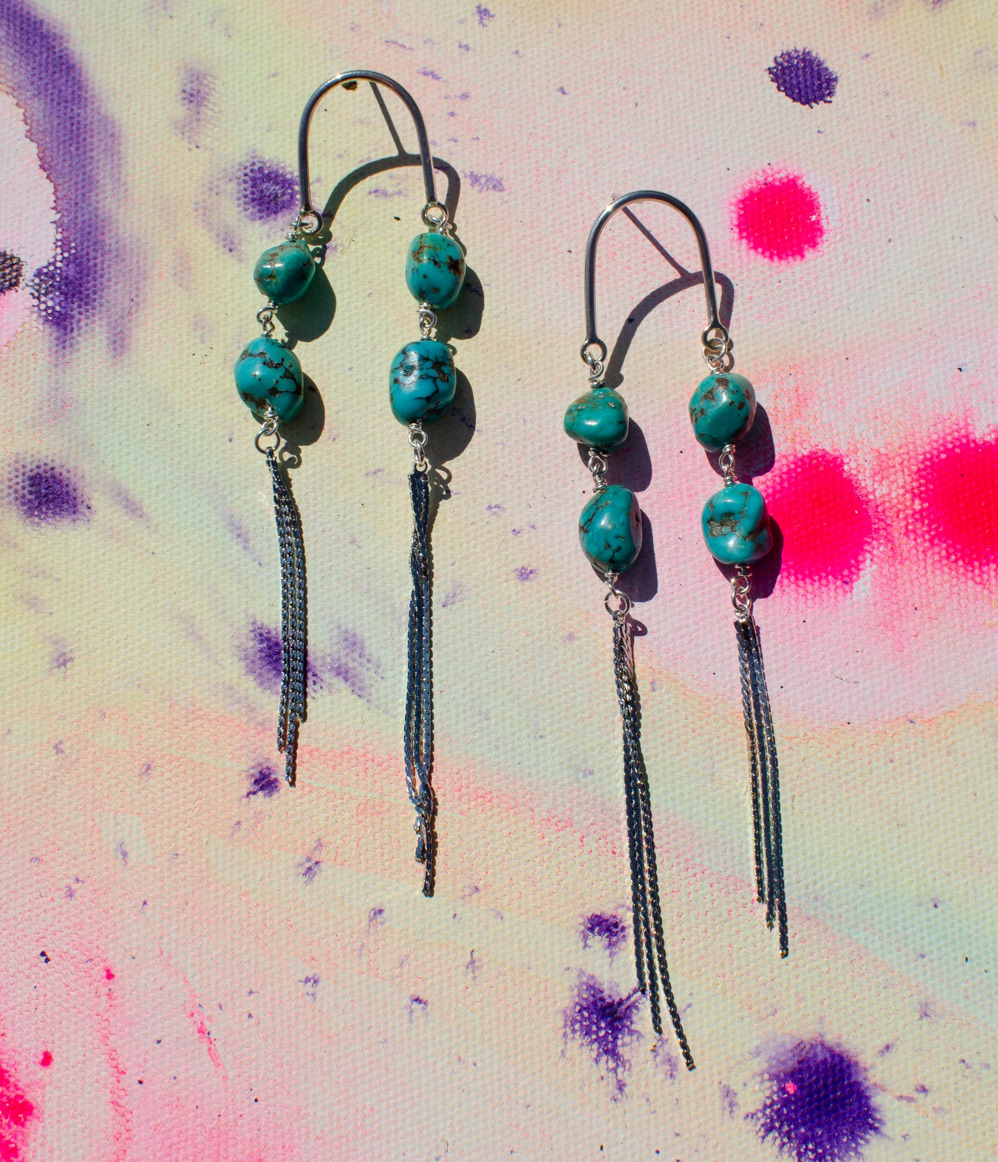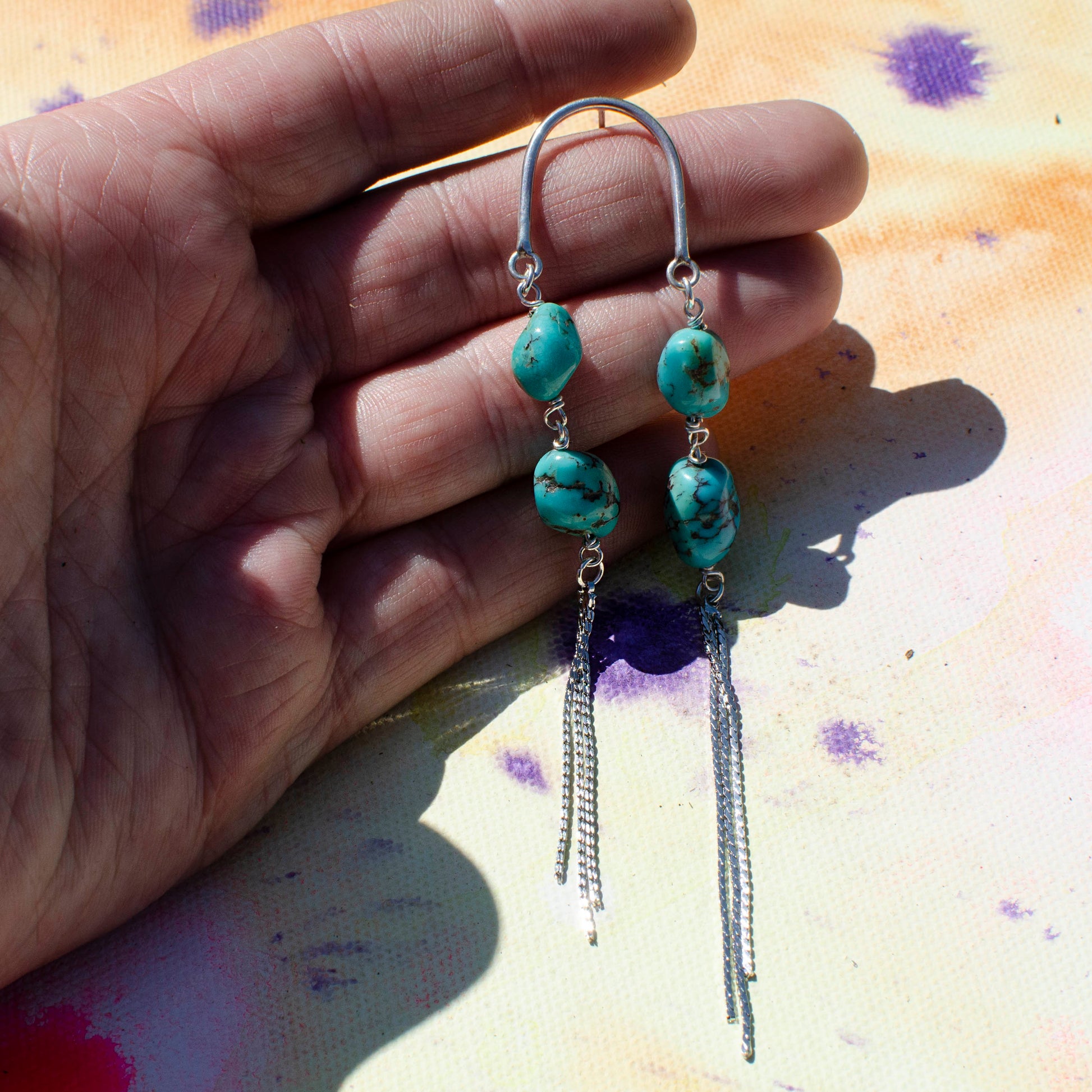 Mod West meets effortless movement. These handmade earrings feature authentic natural turquoise nuggets paired with cascading sterling silver tassels for a look that’s both bold and easy to wear.