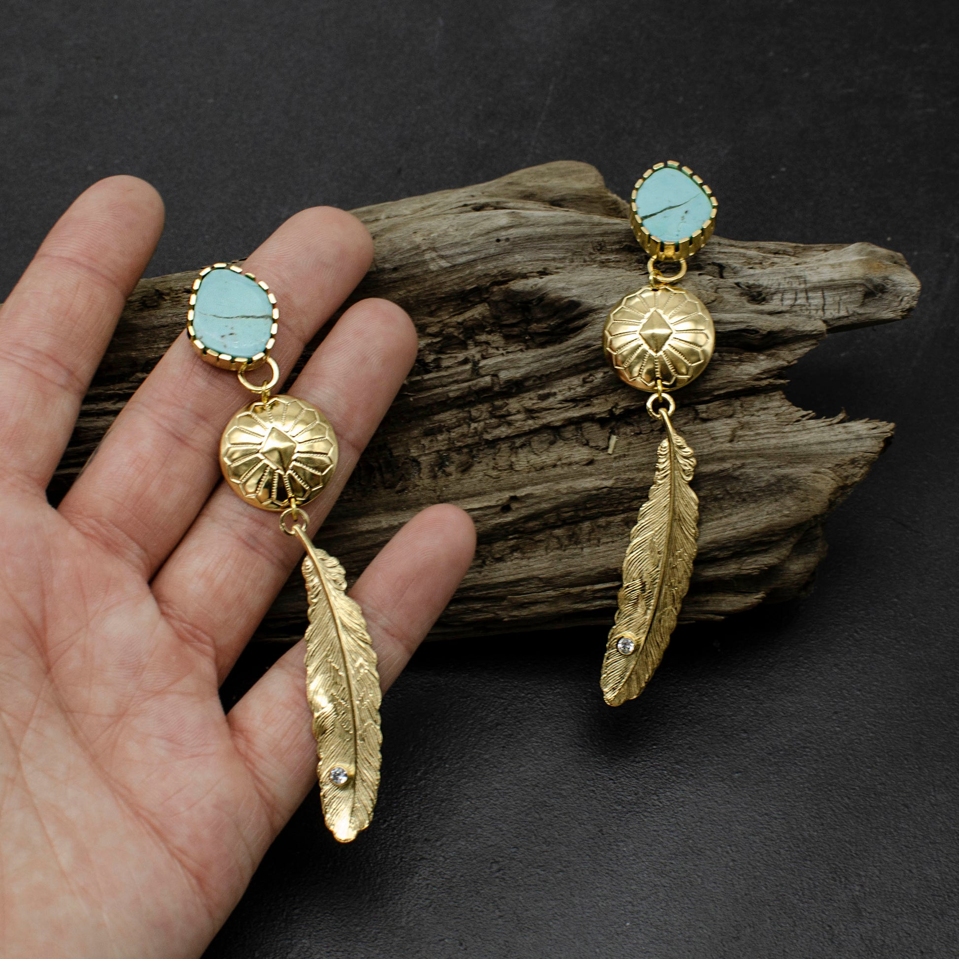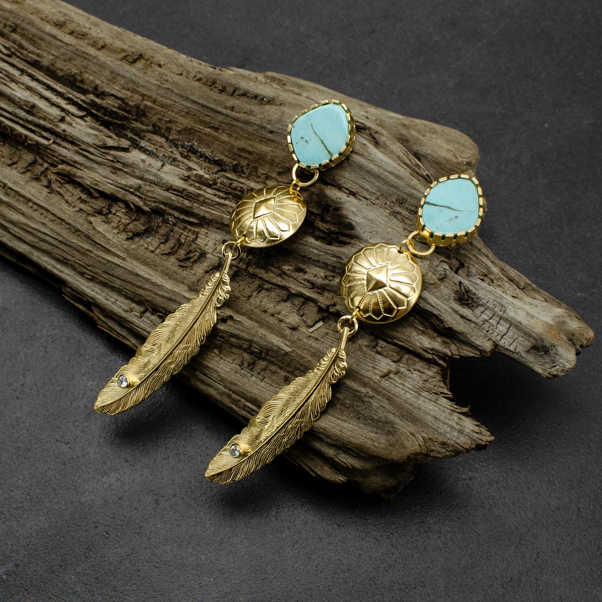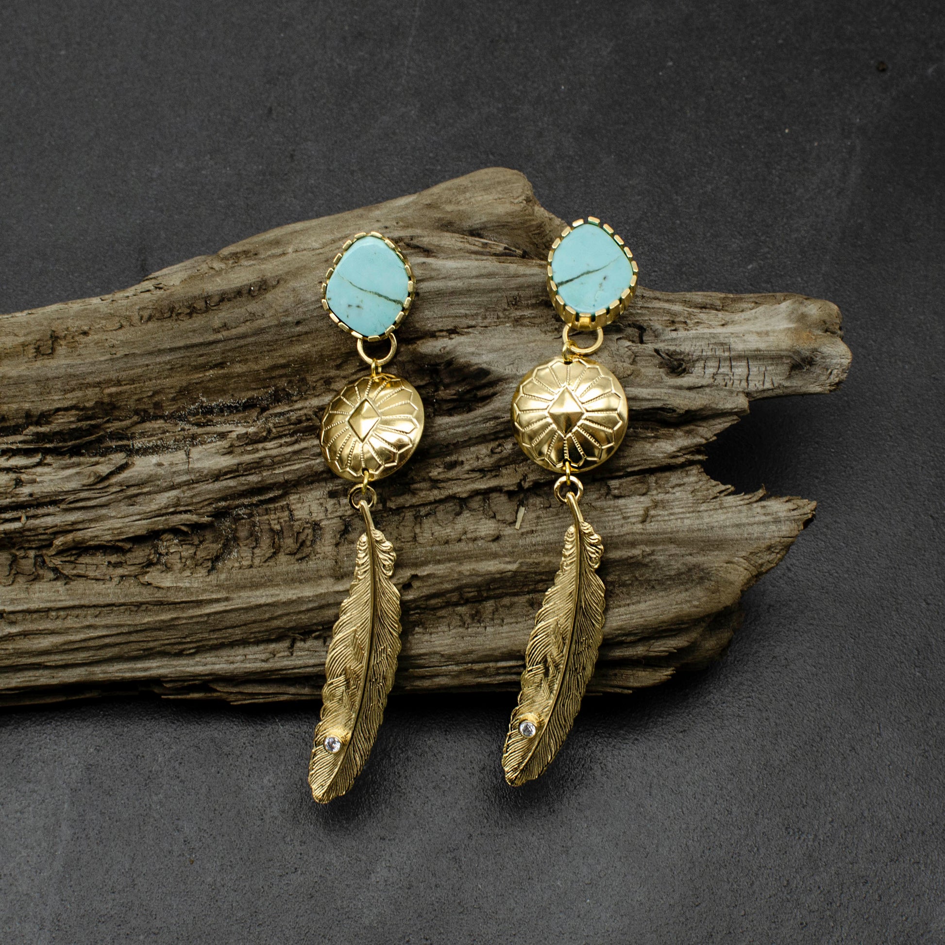 Introducing the unique Sleeping Beauty Concho & Feather Earrings, handmade in Nashville for a touch of modern cowgirl chic. Crafted with sterling silver posts for comfortable wear, these statement earrings feature a stunning Sleeping Beauty turquoise concho and delicate gold-tone feathers. Each feather is accented with a 3mm cubic zirconia for a subtle sparkle. Handmade in brass and heavily plated in 14k in the United States, they're ready to ship and sure to turn heads wherever you go. Plus, they feature American-mined authentic Sleeping Beauty matching cabochons for an extra touch of luxury.