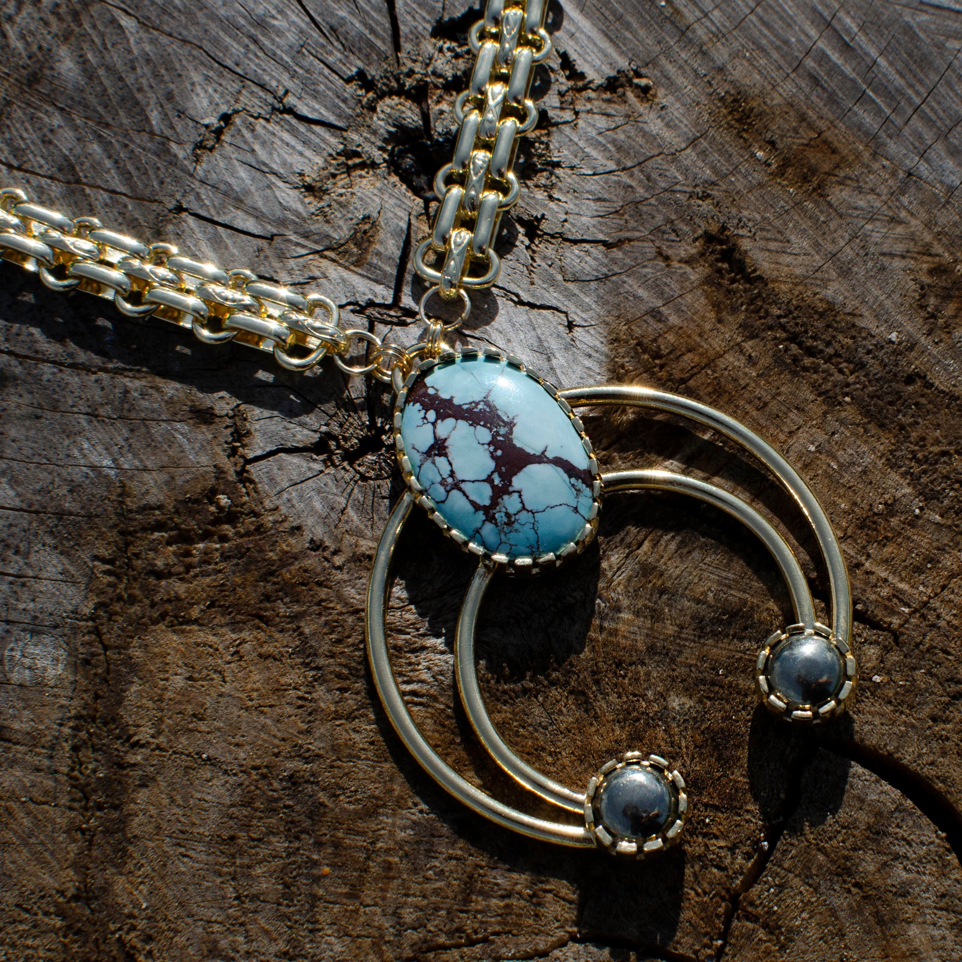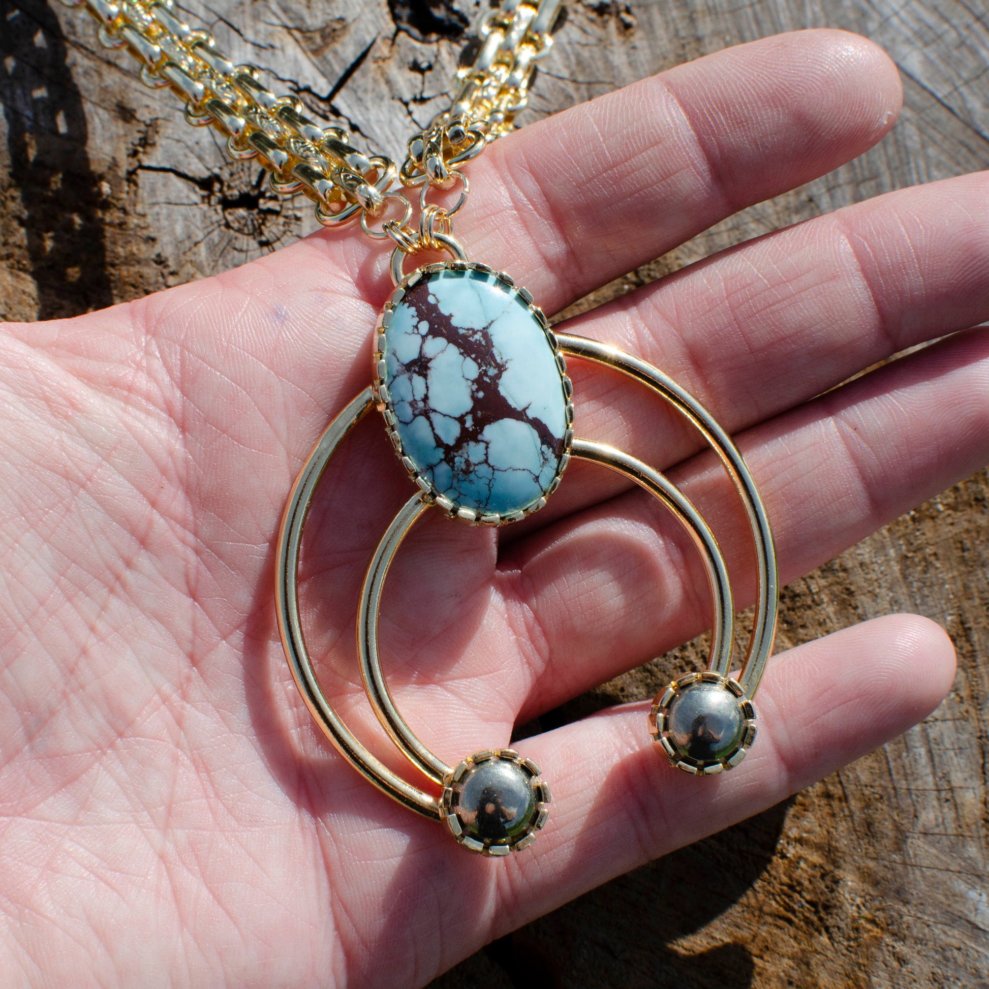 A mini statement with major shine. This one-of-a-kind squash blossom pendant features a striking natural turquoise cabochon paired with two round 10mm golden pyrite stones. Set in a 14k gold-plated frame and strung on a bold 16" 14k gold-plated chain, this piece blends earthy charm with celestial sparkle.