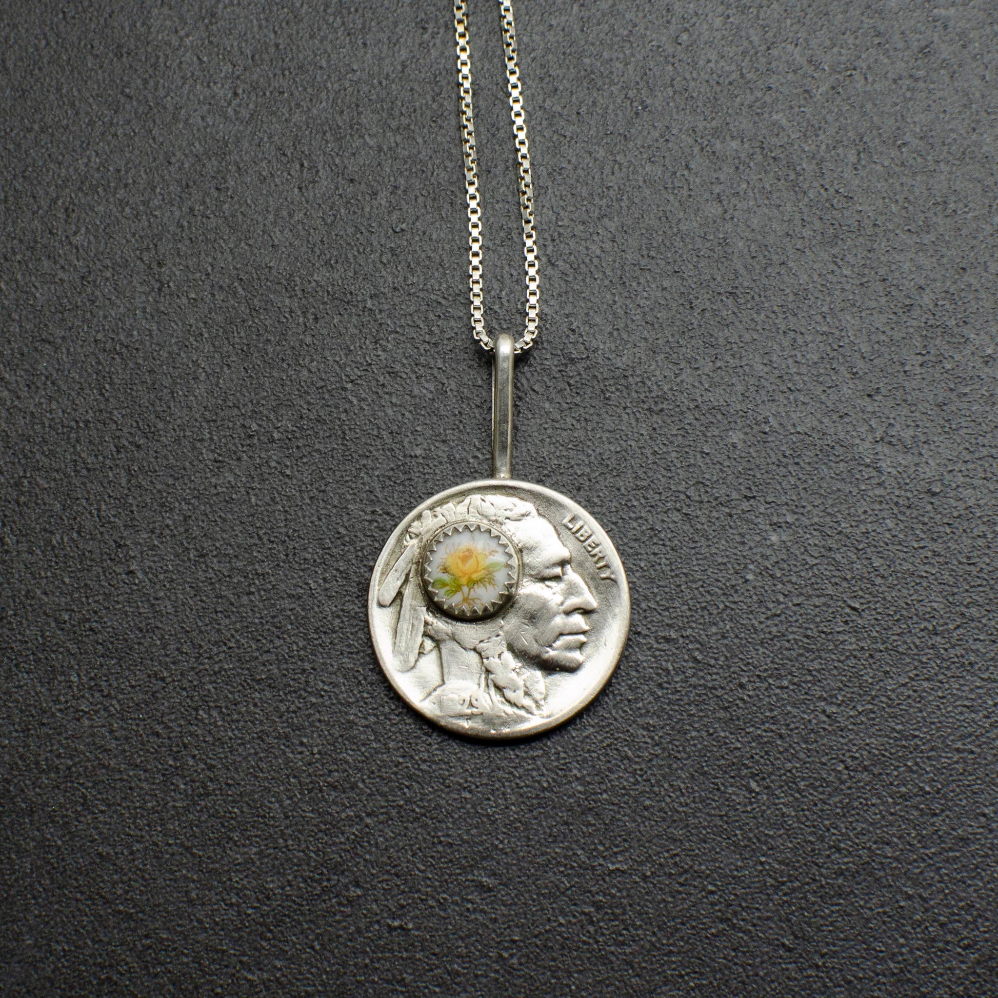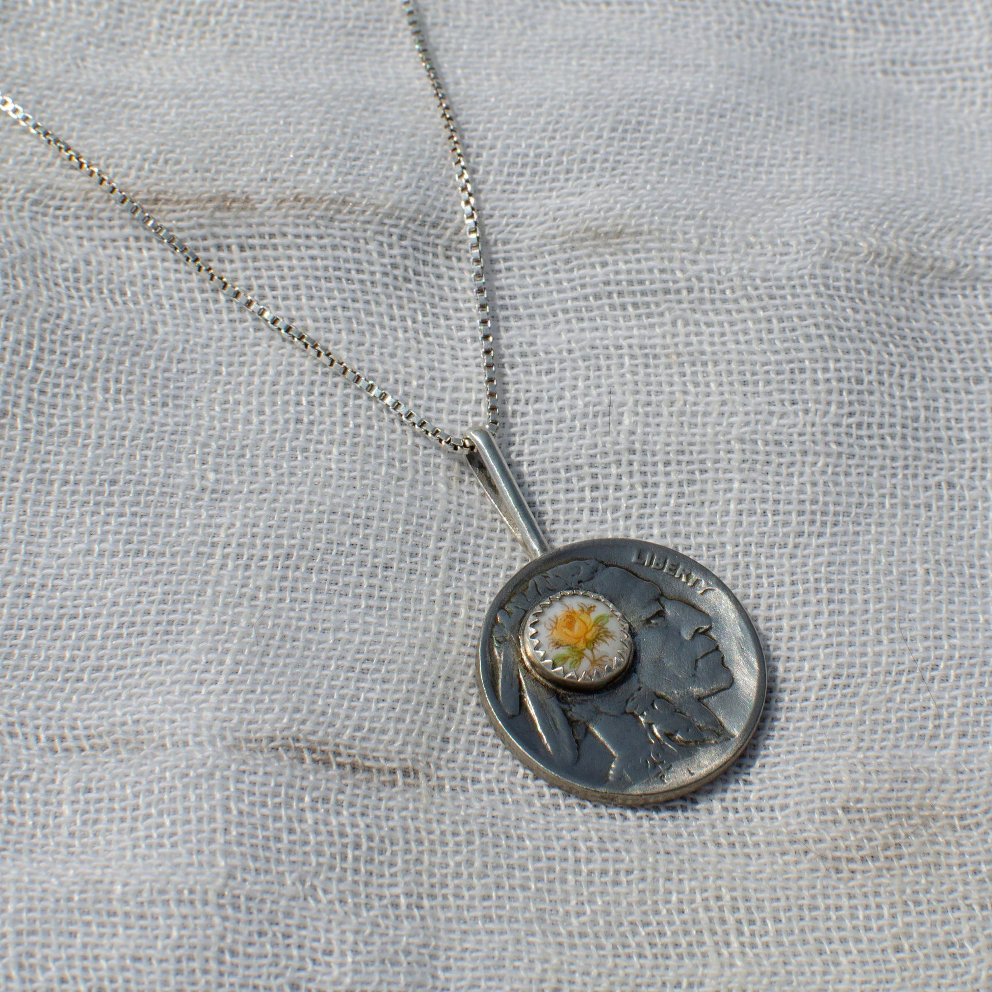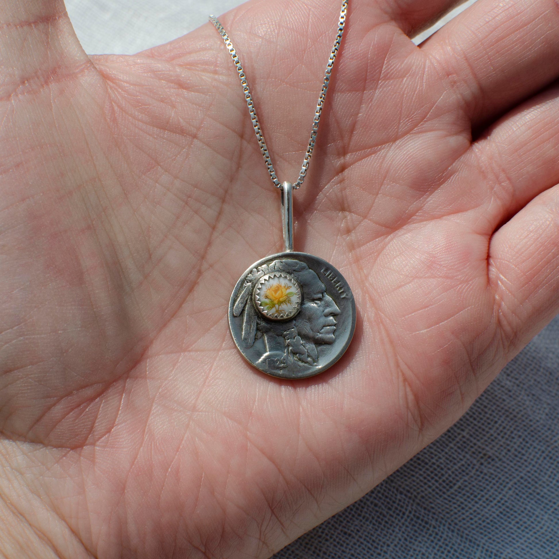 Embrace a touch of vintage elegance with this one-of-a-kind necklace, featuring an authentic buffalo nickel coin that’s over 100 years old, adorned with a 4mm natural yellow floral vintage dead stock cabochon. Handmade in Nashville, this exquisite piece showcases a versatile Silver plated cable chain, making it a perfect complement to both gold and silver jewelry collections.