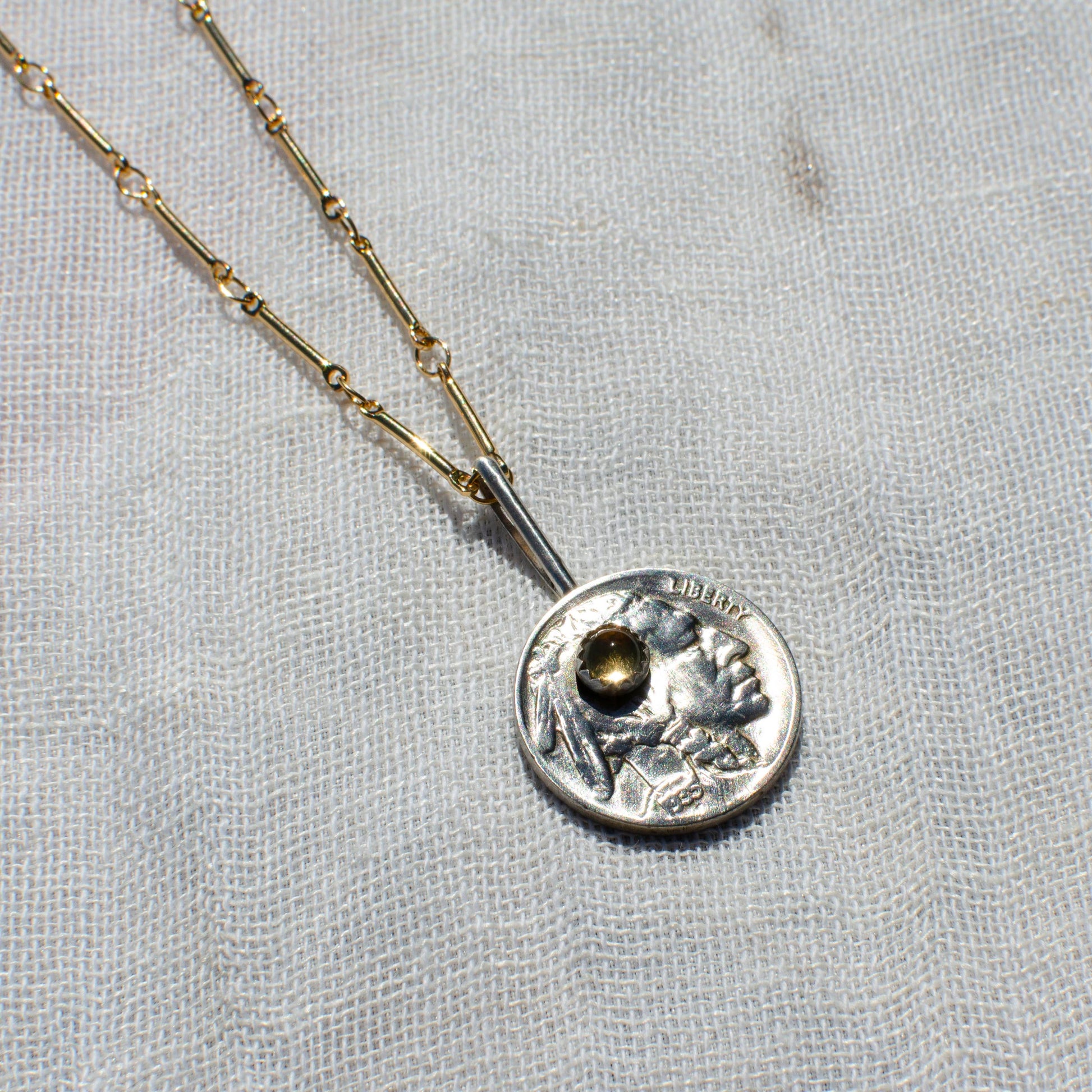 Embrace a touch of vintage elegance with this one-of-a-kind necklace, featuring an authentic buffalo nickel coin that’s over 100 years old, adorned with a 4mm natural citrine cabochon. Handmade in Nashville, this exquisite piece showcases a versatile 14k gold-plated bar link chain, making it a perfect complement to both gold and silver jewelry collections.