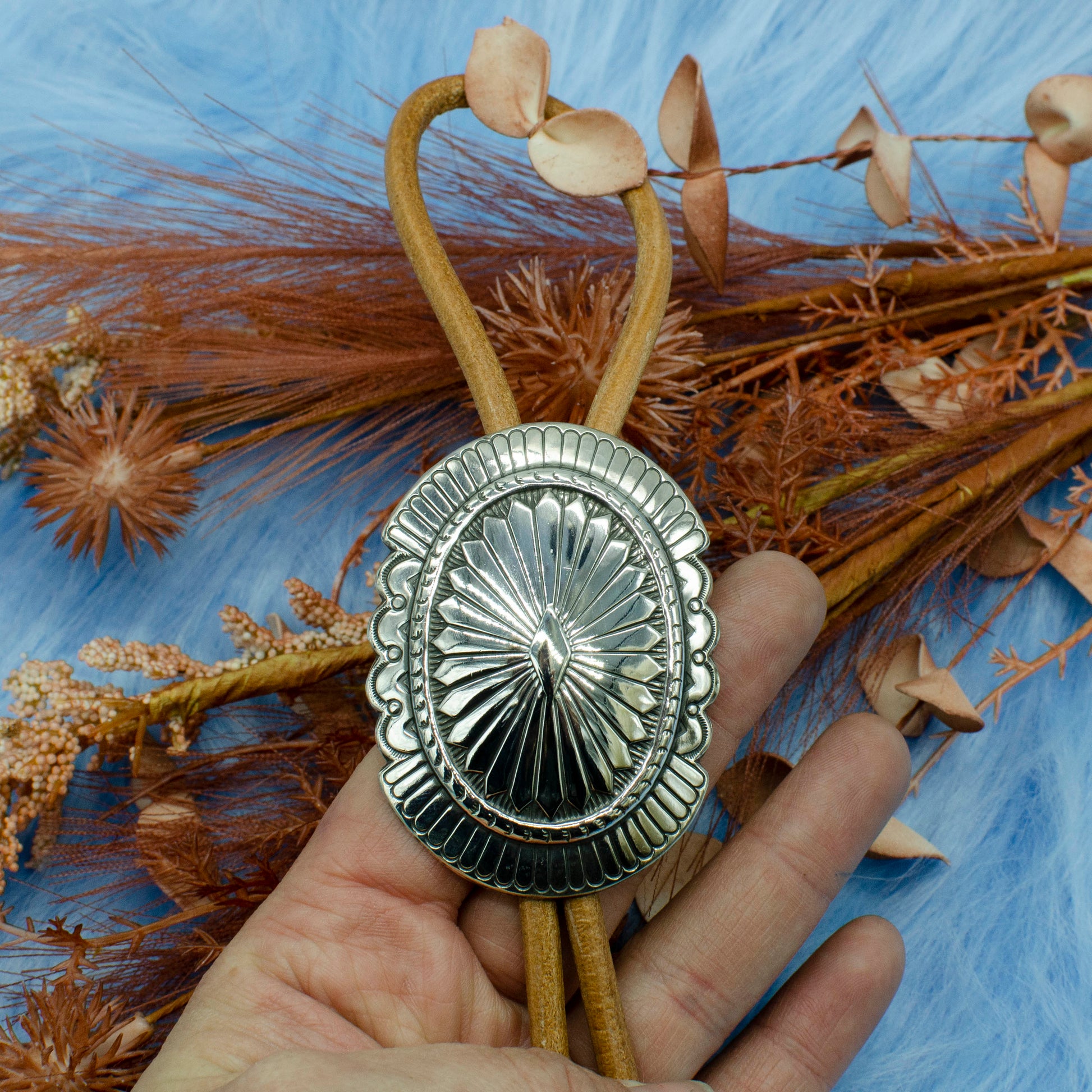 Handmade in Nashville, this sterling silver bolo features a stunning artisan-crafted Southwest concho, shaped using a hydraulic press for a unique design. The lightweight piece boasts a high-polish finish, creating a bold yet refined look. Set on a light tan 5mm leather cord with sterling silver bolo tips, this statement piece is perfect for adding a touch of Western flair to any outfit. Get one of this trending style today!