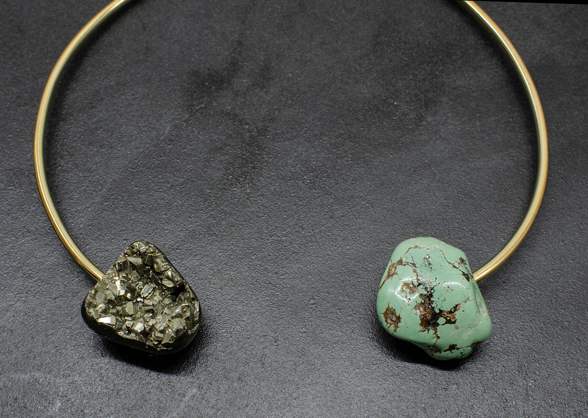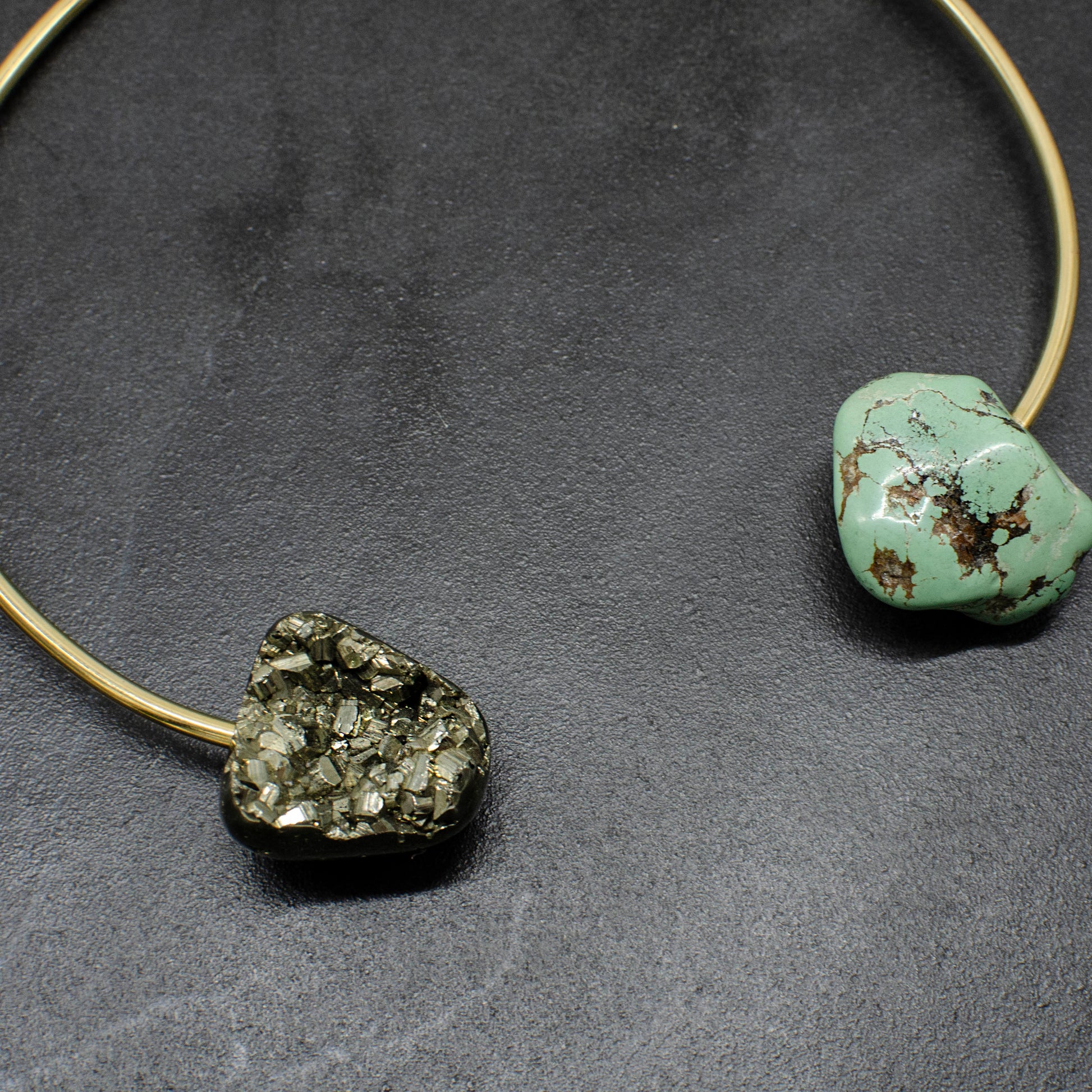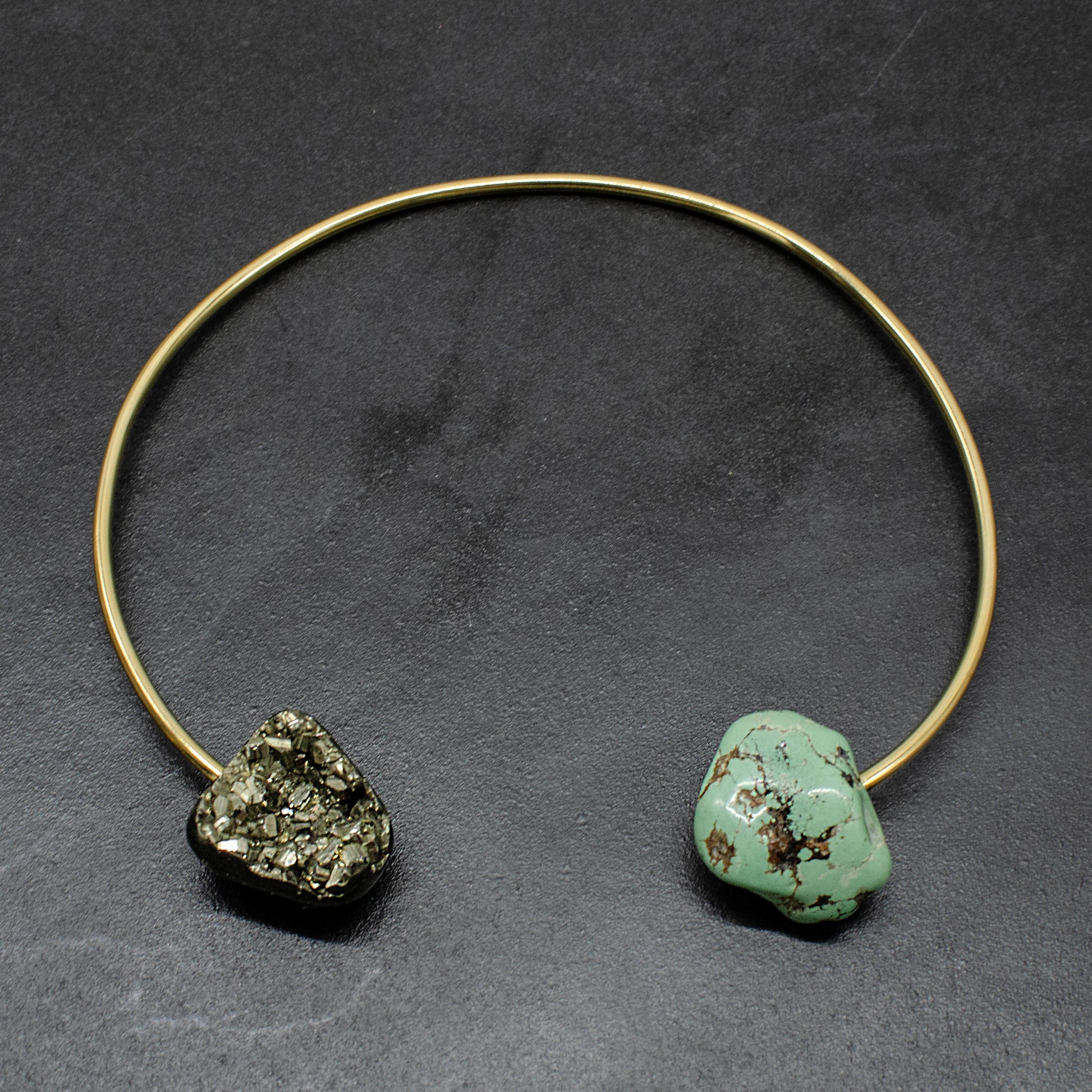 Handmade Peruvian Pyrite and Turquoise collar. Crafted with care and attention to detail, this necklace showcases a hand-drilled Peruvian pyrite stone and turquoise nugget. Measuring 13 inches, each piece is meticulously hand-hammered to fit the shape of your neck perfectly. Versatile enough to pair with both formal attire and casual outfits, this necklace is a timeless addition to any wardrobe. Proudly handmade in Nashville, it reflects our passion for craftsmanship and creativity from the very beginning.