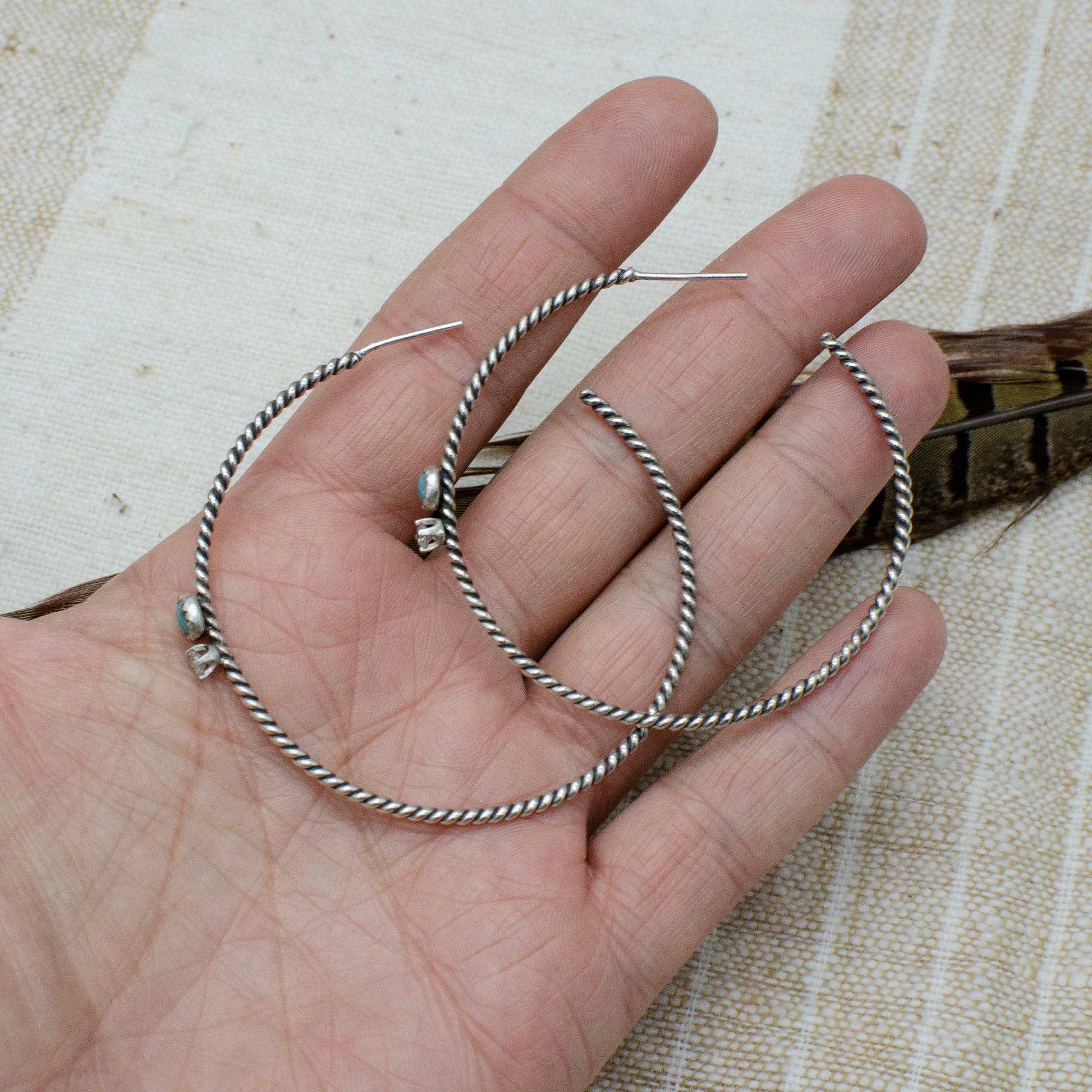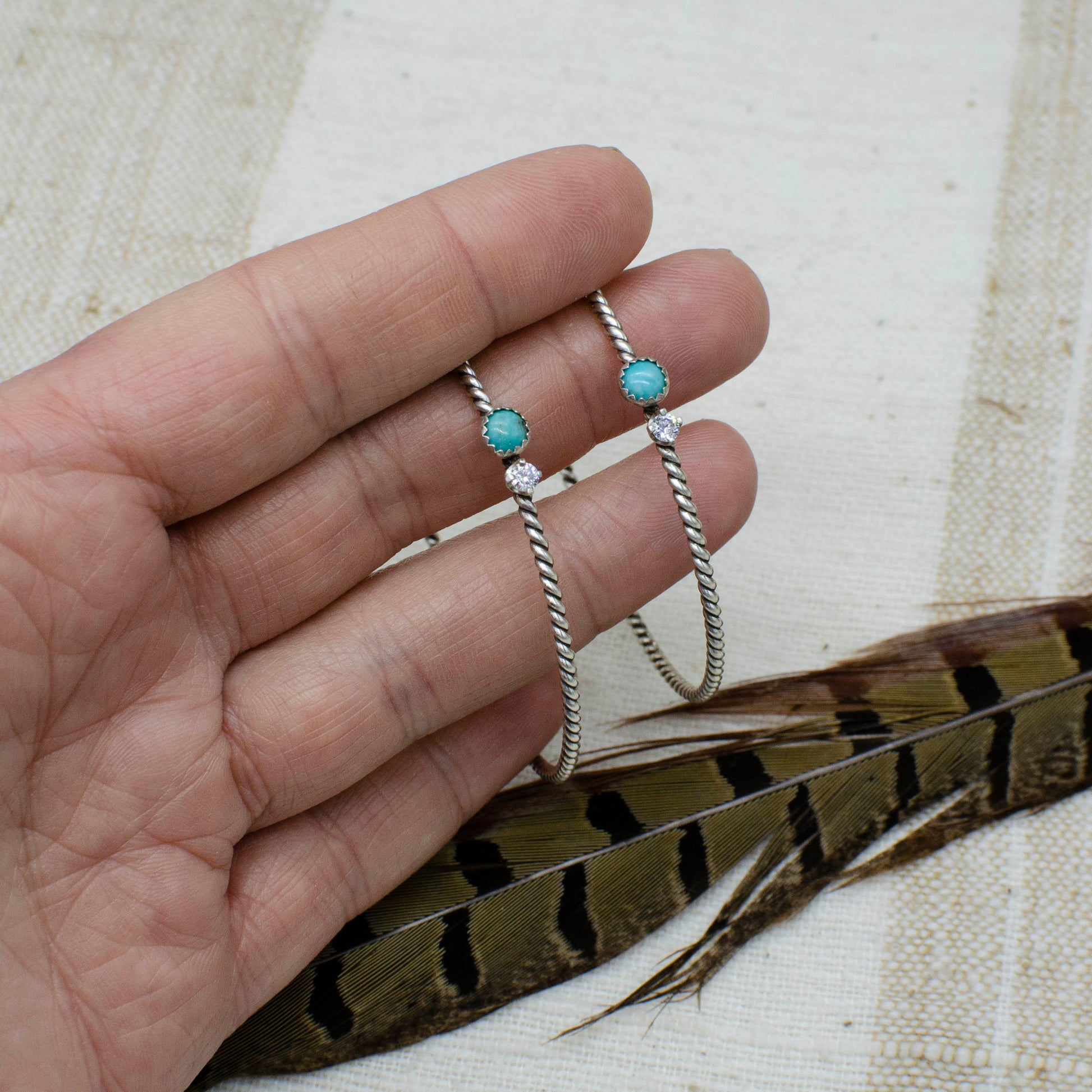 Handmade in Nashville, these sterling silver Twisted Sparkle Hoops feature prong set 3mm stones and 5mm turquoise cabochons for a western flair. Their light weight ensures they are easy to wear and perfect for everyday use. Expertly crafted with a touch of sparkle, these hoops add a unique twist to any outfit.