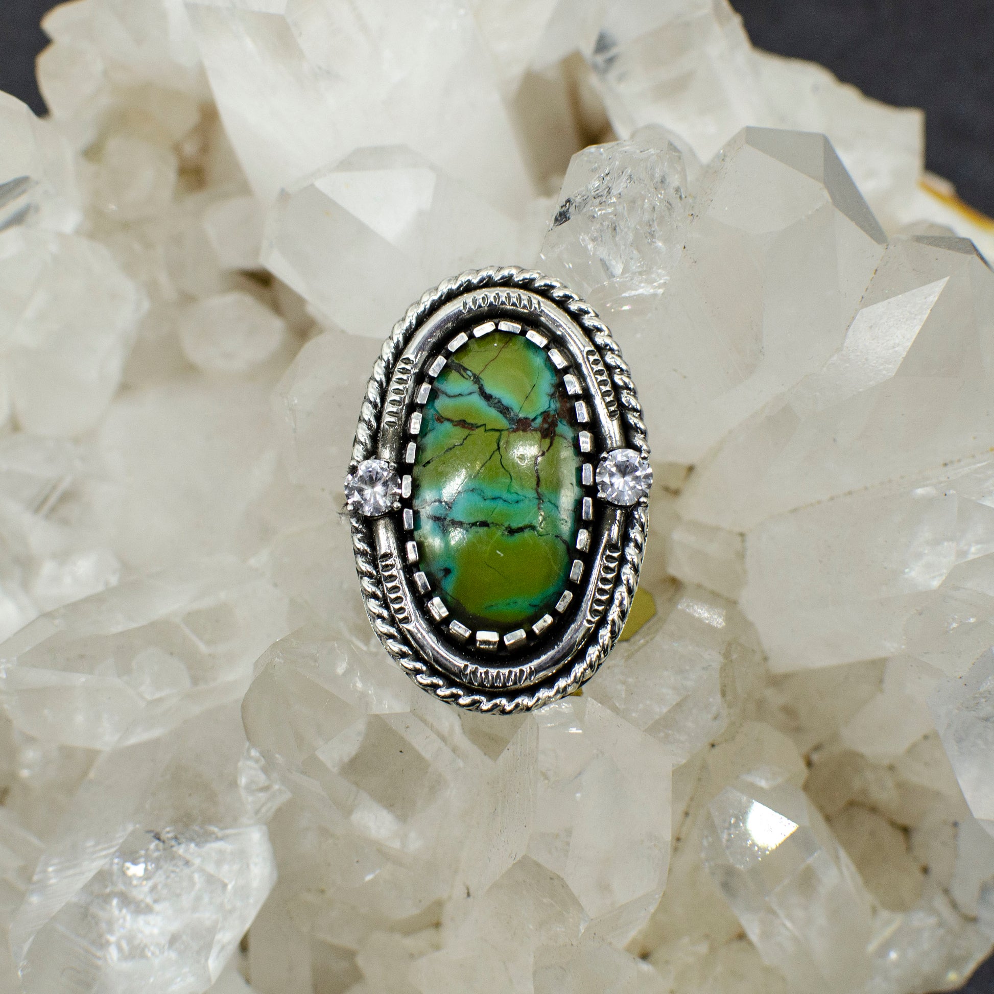 -Featuring a Tibetan turquoise oval cabochon and accented by two 4mm prong set cz stones.